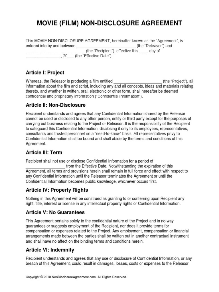 Free Film (Movie) NonDisclosure Agreement (Nda) Template Pdf Word