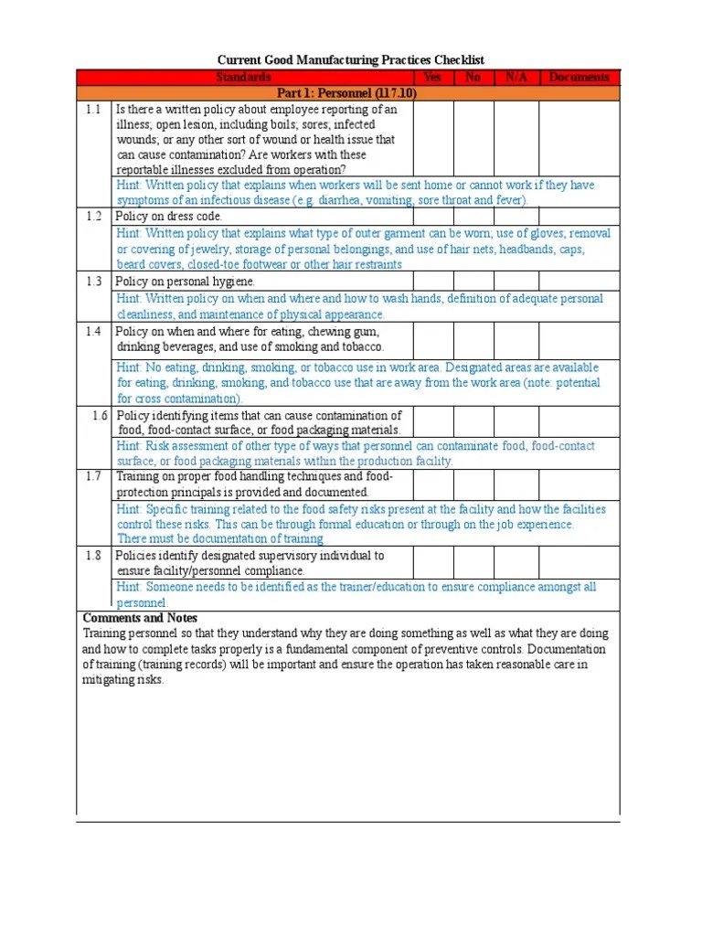 GMP Checklist Template Series Processes & Controls Safe Food Alliance