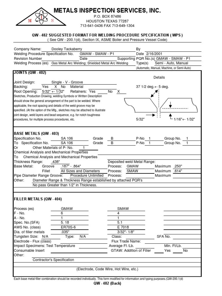 Metals Inspection Services, Inc. Qw 482 Suggested Format For Welding